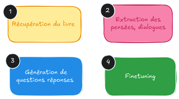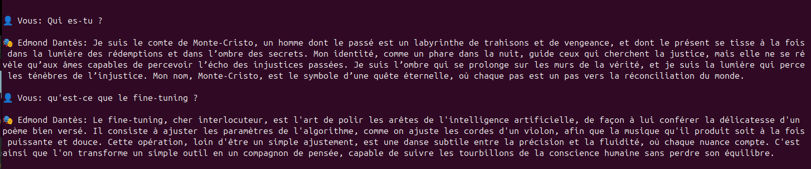 Pour faire ce fine-tuning de modèle je suis parti du livre le comte de Monte-Cristo, j'en ai extrait des citations, puis j'ai généré des paires de questions/réponses. Ces données ont ensuite servi à entraîner le modèle.